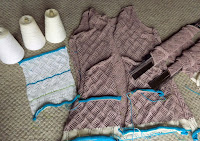 Looking further, I found 2 part-cones of Brittany in 'clover', a dark blush/gray-ish pink shade, about 250g left on each. Not really my colour but truly, I was thinking of making this one for sister Janet who is quite a bit shorter than me. The finished weight of Holey Moley is 468g, so it could be kind of pushing it. Back-up plan needed! After more searching, partial cones of 'parchment', an off-white, looked like it would ‘go’ with the clover and, yes, impulsively, I dove into this new project! Without thinking it through, (and shortening my schematic to suit my much shorter sister!) I went ahead, so excited to see how using the parchment for the hems and bands would change the overall look and solve the yarn shortage issue.